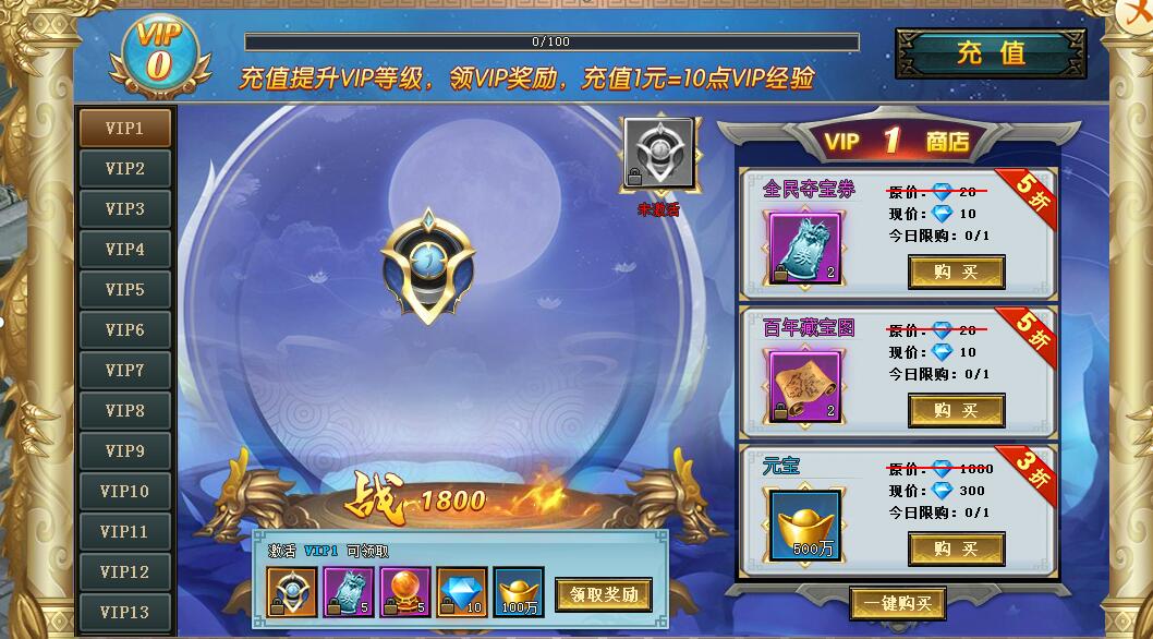| 1 | 100 | VIP1勋章 | 凡品雷神碎片*5 | 角色经验丹*5 | 元宝*500000 |